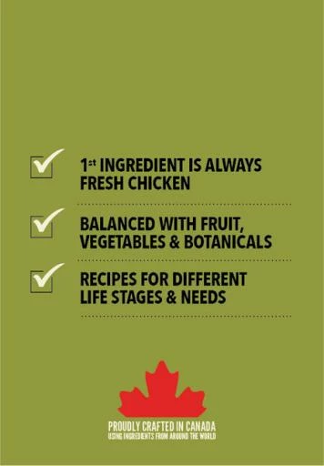 Poulet frais (20,5%), poulet déshydraté (20%), lentilles rouges entières, pois verts entiers, fibres de pois, abats de poulet frais (foie, cœur) (5%), dinde déshydratée (5%), hareng déshydraté (4%), œufs (4%), limande crue (4%), pois chiches entiers, lentilles vertes entières, pois jaunes entiers, amidon de pois, graisse de poulet (1%), huile de poisson (1%), foie de dinde cru (0, 5%), sel, algues séchées, potiron entier frais, courge musquée entière fraîche, carottes entières fraîches, pommes entières fraîches, poires entières fraîches, courgette entière fraîche, racine de chicorée séchée, chou frisé frais, épinards frais, feuilles de navet fraîches, feuilles de betterave fraîches, airelles entières fraîches, myrtilles entières fraîches, airelles entières fraîches, amélanches entières fraîches,