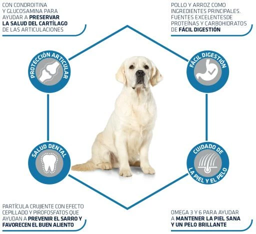 Ingrédients : Poulet (16%), protéines de volaille déshydratées, riz (15 %), blé, maïs, farine de gluten de maïs, graisses animales (stabilisées avec de la vitamine E), protéines animales hydrolysées, pulpe de betterave, oelig;uf déshydraté, levure, huile de poisson, chlorure de potassium, protéines plasmatiques, pyrophosphate de sodium, extraits d’agrumes riches en bioflavonoïdes, glucosamine, sulfate de chondroïtine.