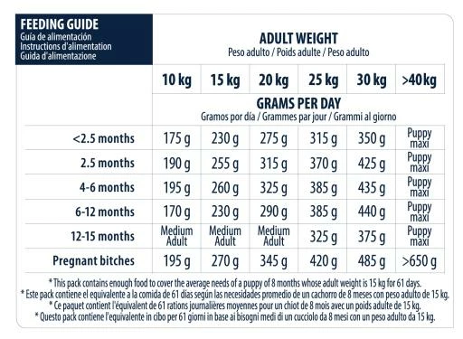 Aliment formulé tout spécialement pour les chiots (de 2 à 12 mois) de taille moyenne (de 10 à 30 kg à l’âge adulte), et les femelles gestantes ou allaitantes.