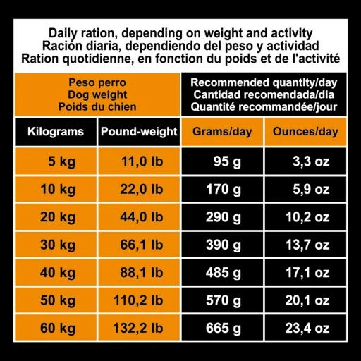 Sa formule aide à maintenir les défenses naturelles du chien grâce aux mannane-oligosaccharides qui stimulent la flore intestinale bénéfique. Les acides gras oméga 3, oméga 6, le zinc et la vitamine A renforcent la peau et le pelage, tandis que le cuivre donne de la brillance. COMPOSITION: viande et sous-produits animaux 30% (poulet 4%), maïs, blé, sous-produits d’origine végétale (pulpe de betterave 1,5%, gousse de caroube 1,5%), graisse de poulet, riz 4%, orge, minéraux et vitamines . COMPOSANTS ANALYTIQUES: Protéine 26%, Teneur en matières grasses 14%, Cellulose brute 2,9%, Matière inorganique 8,2%, Humidité 9%. ADDITIFS NUTRITIONNELS: Vitamine A 17500 UI / kg, Vitamine D-3 1000 UI / kg, Vitamine E (dl?-tocophérolacétate) 100 mg / kg, E1 / Fer 125 mg / kg, E4 / Cuivre 10 mg / kg, E5 / Manganèse 9 mg / kg, E6 / Zinc 110 mg / kg, E2 / Iode 1,75 mg / kg, E8 / Sélénium 0,25 mg / kg. ADDITIFS TECHNOLOGIQUES: Antioxydants. MODE D’EMPLOI: Donner la ration journalière, de préférence divisée en 2 ou 3 prises par jour, et toujours aux mêmes heures. La quantité de nourriture peut varier en fonction de l’activité, de la race du chien et des conditions environnementales. Les chiens doivent toujours recevoir de l’eau propre et fraîche. Conserver le récipient bien fermé, dans un endroit frais, sec et ventilé, à l’abri de la lumière et du soleil.