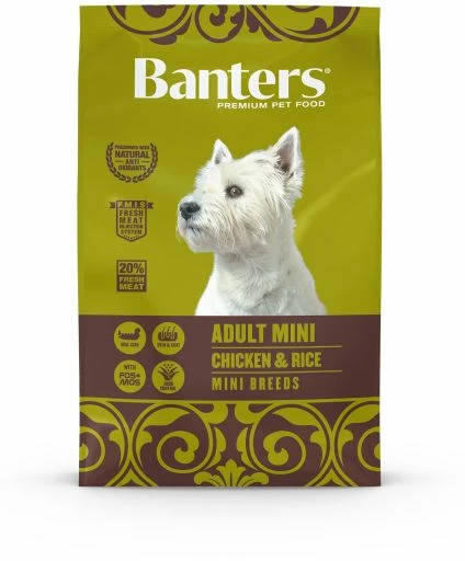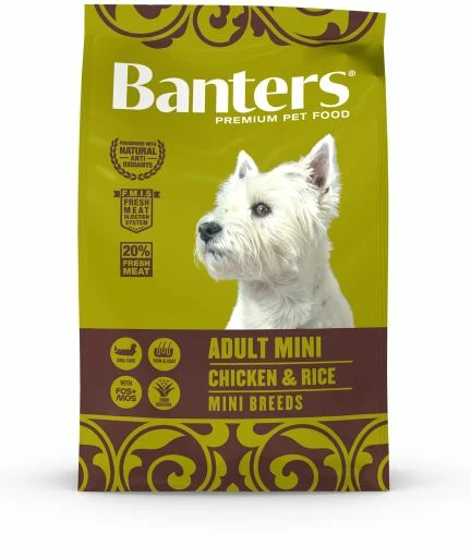 Banters Adult Mini est un aliment complet et Ă©quilibrĂ©, adaptĂ© Ă la phase adulte des chiens de petite race (1 Ă 10 kg), de 10 mois Ă 8 ans. Les croquettes ont Ă©tĂ© spĂ©cialement conçues pour ĂŞtre croquantes et faciles Ă mâcher. Sa formule renforcĂ©e aide Ă maintenir les dĂ©fenses naturelles du chien grâce aux mannan-oligosaccharides qui stimulent la flore intestinale bĂ©nĂ©fique. Les acides gras omĂ©ga 3 et omĂ©ga 6, le zinc et la vitamine A renforcent la peau et le pelage, tandis que le cuivre apporte de la brillance. Poulet frais (20%). ProtĂ©ines de poulet dĂ©shydratĂ©es. Riz (15%). Huile de poulet. De l’orge. MaĂŻs (corn). Le blĂ©. Pulpe de betterave. Hydrolysat de foie de poulet. Huile de poisson. levure. Substances minĂ©rales. Des Âśufs. ChicorĂ©e (FOS 0,05%). Mannan-oligosaccharides (MOS 0,05%). Yucca Schidigera (200 mg/kg).