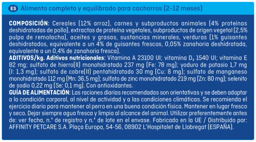 Céréales (12% riz) viandes et sous-produits animaux (4 % de protéines de poulet déshydratées) extraits de protéines végétales sous-produits d’origine végétale (2,5% pulpe de betterave) huiles et graisses substances minérales légumes (1% de pois déshydratés, équivalent à 4% de pois frais, 0,05% de carotte déshydratée, équivalent à 0,4% de carotte fraîche).
