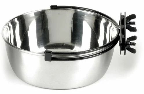 Gamelle en métal en forme de coupe pour chiens. Elle est munie d’un clip pour l’attacher à un panier de transport. Capacité : Petit – 900 ml Moyen – 1,9 L Grand – 2,8 L Ø Diamètre : Petit – 15,5 cm Moyen – 20 cm Grand – 25 cm