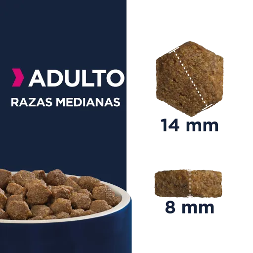 Croquettes au poulet frais pour chiens adultes de taille moyenne, avec des protéines de haute qualité, des antioxydants, des acides gras oméga et de la L-carnitine. Croquettes hexagonales pour le nettoyage des dents.