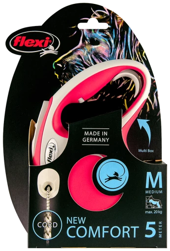 Laisse FLEXI NEW COMFORT CORD RED CORD La laisse bicolore au design parfait attire notre attention. New Comfort vous offre toutes les caractĂ©ristiques que vous souhaitez pour une promenade que vous adorerez. Plus de contrĂ´le grâce Ă de meilleurs freins. D’autres accessoires comme le système d’Ă©clairage Ă LED ou la Multi Box pour ranger les friandises ou les sacs d’hygiène. Profitez du voyage !Â