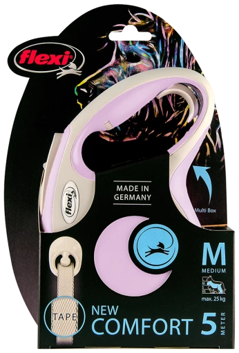 FLEXI NEW COMFORT STRAP PINK La laisse bicolore au design parfait attire notre attention. New Comfort vous offre toutes les caractéristiques que vous souhaitez pour une promenade que vous adorerez. Plus de contrôle grâce à de meilleurs freins. D’autres accessoires comme le système d’éclairage à LED ou la Multi Box pour ranger les friandises ou les sacs d’hygiène. Profitez du voyage !