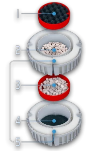 -Les paniers de filtration amovibles et empilables empêchent la dérivation de l’eau et ont une contenance en masses filtrantes de 3,9 L (1 gal US).