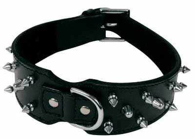 Collier en cuir noir avec trois rangées de pointes métalliques de la collection d’accessoires en cuir Gloria.