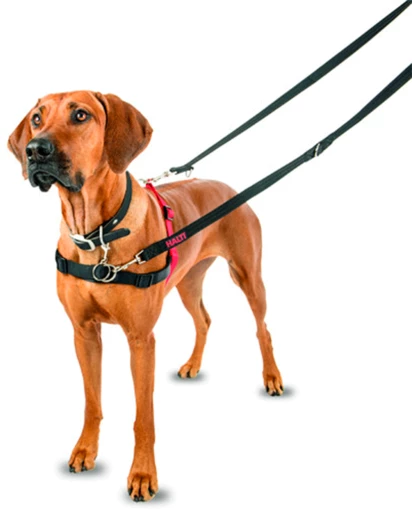 Ses deux crochets permettent l’utilisation d’une laisse double pour exercer un meilleur contrôle sur la traction.