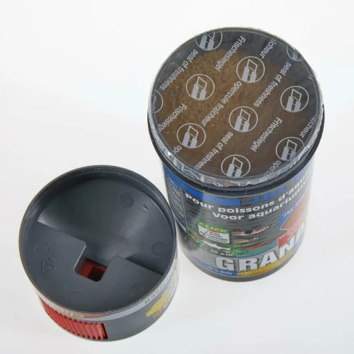 Aliment de base Premium en granulĂ©s pour petits poissons d’aquarium, avec doseur Ă clics.