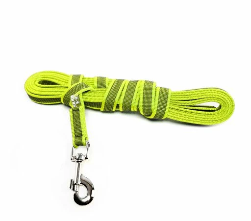 Cette laisse est fabriquée en matériau textile durable, agréable au toucher. Les fils de caoutchouc tissés dans le matériau assurent une prise optimale pour la conduite du chien. Elle est fonctionnelle même en cas de pluie ou d’humidité, pour les promenades, les activités sportives et l’entraînement.