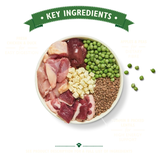 Comme tous nos aliments secs, cette délicieuse et complète recette sans céréales, avec de la viande de poulet et de canard fraîchement préparée, est pleine de bienfaits naturels. Nous incorporons également de la glucosamine, de la chondroïtine pour des os et des articulations solides. Et des prébiotiques pour une digestion saine, et des nutriments essentiels pour renforcer le système immunitaire de votre chien. D’autres ingrédients sont également ajoutés pour améliorer la santé globale de votre animal, comme l’huile de saumon, qui est une source fantastique d’acides gras oméga-3, lesquels contribuent au bon fonctionnement du cur et du cerveau et maintiennent la peau et le pelage en bon état. Nous élaborons cette recette avec des légumes, des fruits et des plantes herbacées, en y ajoutant toutes les vitamines et minéraux essentiels dont votre chien a besoin dans son alimentation quotidienne.