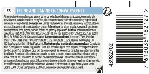 La formule CN Convalescence féline et canine est recommandée jusqu’à la guérison ou la convalescence complète. Réchauffer la nourriture à température ambiante peut contribuer à améliorer l’appétence des chats. Cette nourriture peut être diluée dans l’eau (1:1) si l’on souhaite une alimentation par sonde. La formule CN Convalescence féline et canine peut être utilisée chez les chats avec des tubes ≥ 9 FG. La ration doit être adaptée à la ration nécessaire en fonction des besoins cliniques. ‘