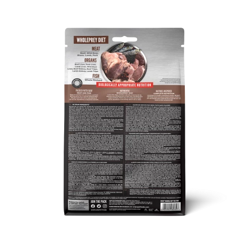 IngrĂ©dients : Viande de bĹ“uf fraĂ®che (11 %), viande de sanglier fraĂ®che (4 %), viande de bison fraĂ®che (4 %), viande d’agneau fraĂ®che (4 %), porc Yorkshire frais (4 %), foie de bĹ“uf frais (4 %), tripes de bĹ“uf fraĂ®ches (4 %), sardine entière fraĂ®che (4 %), Ĺ“ufs entiers frais (4 %), foie de sanglier frais (4 %), viande d’agneau dĂ©shydratĂ©e (4 %), bĹ“uf dĂ©shydratĂ© (4%), hareng entier dĂ©shydratĂ© (4%), porc dĂ©shydratĂ© (4%), foie d’agneau frais (3,5%), boyau d’agneau frais (3,5%), sardine entière dĂ©shydratĂ©e (3%), foie de porc frais (3%), lentilles rouges, lentilles vertes, pois verts, fibres de lentilles, pois chiches, pois jaunes, haricots pinto, graisse de bĹ“uf (1%), graisse de porc (1%), huile de hareng (1%), cartilage de bĹ“uf dĂ©shydratĂ© (1%), foie de bĹ“uf lyophilisĂ©, tripes de bĹ“uf lyophilisĂ©es, foie d’agneau lyophilisĂ©, tripes d’agneau lyophilisĂ©es, potiron frais, courge musquĂ©e fraĂ®che, courgette fraĂ®che, panais frais, carottes fraĂ®ches, pommes fraĂ®ches, poires fraĂ®ches, choux frais, Ă©pinards frais, feuilles de betteraves fraĂ®ches, feuilles de navet fraĂ®ches, feuilles de navet fraĂ®ches, varech brun, airelles entières, myrtilles entières, amĂ©lanches entières, racine de chicorĂ©e, curcuma, chardon marie, racine de bardane, lavande, racine de guimauve, Ă©glantier.
