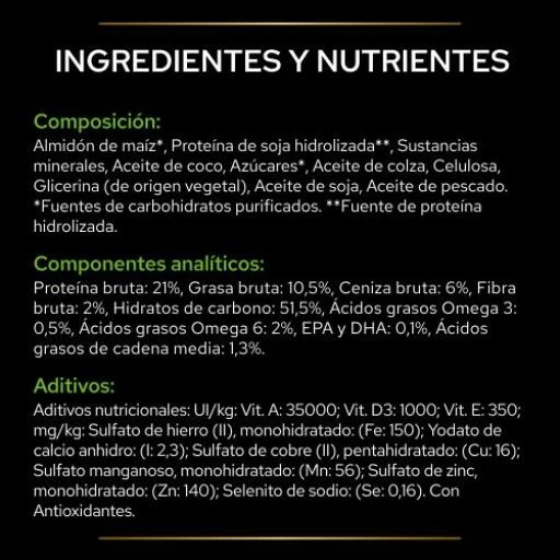 Amidon de maïs 1, protéine de soja hydrolysée 2, substances minérales, huile de coco, sucre1, huile de colza, cellulose, huile de soja, huile de poisson 1Sources de glucides purifiés 2Sources de protéines.