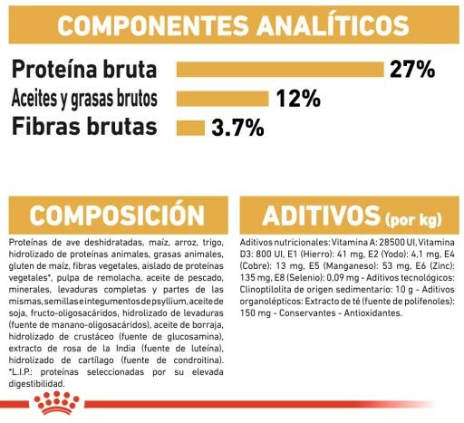 Ingrédients: protéines de volaille déshydratées, maïs, riz, blé, graisses animales, gluten de maïs, hydrolysat de protéines animales, fibres végétales, isolat de protéines végétales (LIP: protéine sélectionnée pour sa très haute assimilation), pulpe de betterave, sels minéraux, huile de poisson , levures, huile de soja, téguments et graines de psyllium, fructo-oligo-saccharides, hydrolysat de levure (source de mannan-oligosaccharides), huile de bourrache, raisins (source de polyphénols) thé vert, hydrolysat de crustacés (source de glucosamine), extrait de calendula de l’Inde (source de lutéine), hydrolysat de cartilage (source de chondroïtine).