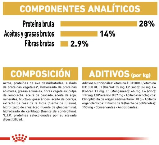 Riz, protéines de volaille déshydratées, isolat de protéines végétales*, graisses animales, hydrolysat de protéines animales, fibres végétales, sels minéraux, pulpe de betterave, huile de poisson, huile de soja, fructo-oligo-saccharides, huile de bourrache, extrait de rose d’Inde (source de lutéine), hydrolysat de crustacé (source de glucosamine), extraits de thé vert et de raisins (sources de polyphénols), hydrolysat de cartilage (source de chondroïtine)