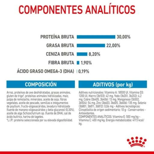 COMPOSITION: Riz, viandes de volaille déshydratées, graisses animales, isolat de protéines végétales*, hydrolysat de protéines animales, maïs, pulpe de betterave, sels minéraux, huile de soja, fi bres végétales, huile de poisson, sel d’acide gras, fructo-oligo-saccharides, téguments et graines de psyllium, hydrolysat de levure (source de manno oligo-saccharides et de béta-glucans), poudre d’oeufs, extrait de rose d’Inde (source de lutéine).