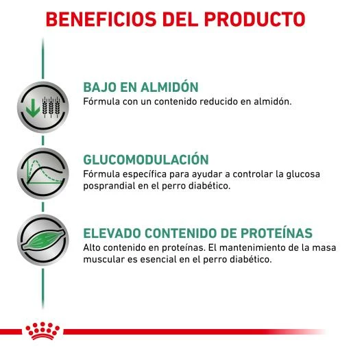 Bienfaits clés Royal Canin Diabetic Low : Il ralentit la digestion dans lintestin grêle et améliore le contrôle de la glycémie chez les chiens diabétiques, grâce aux fibres alimentaires.