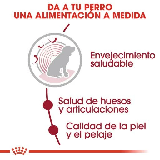 Contribue à la bonne santé des os et des articulations des chiens âgés de taille moyenne.