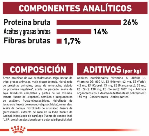 Protéine: 26% – Matières grasses: 14% – Cendres brutes: 4.7% – Fibres alimentaires brutes: 1.7% – EPA/DHA: 4 g/kg.*L.I.P.: protéine sélectionnée pour sa très haute digestibilité.