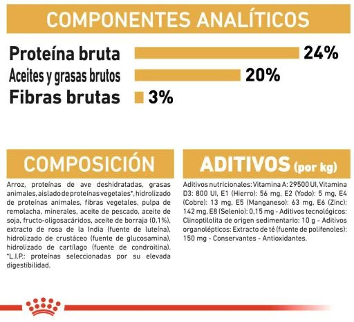 Protéine: 24% – Matières grasses:20% – Cendres brutes: 5.6% – Cellulose brute: 3% – Au kg: Acides gras Omega 3: 7.3 g ycompris EPA et DHA: 3 g.*L.I.P.: Protéines sélectionnées pour leur très haute digestibilité