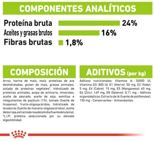 COMPOSITION: riz, farine de maïs, maïs, viandes de volaille déshydratées, graisses animales, gluten de maïs, isolat de protéines végétales L.I.P.*, hydrolysat de protéines animales, pulpe de chicorée, sels minéraux, huile de poisson, huile de soja, tomate déshydratée (source de lycopène), téguments et graines de psyllium (1%), fructo-oligosaccharides, hydrolysat de levure (source de manno oligosaccharides), huile de bourrache, extraits de thé vert et de raisin (sources de polyphénols), extrait de rose d’Inde (source de lutéine).