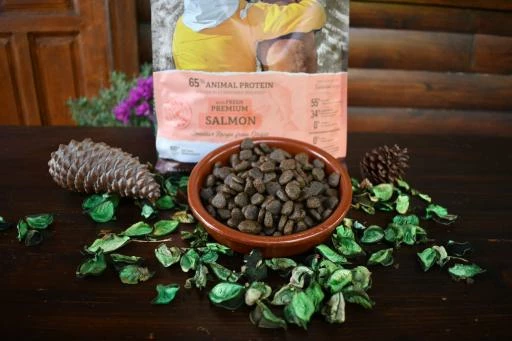 Saumon frais 33%. Saumon déshydraté. Pomme de terre déshydratée. Protéine de pommes de terre. Huile de poulet. Saumon hydrolysât. Pulpe de betterave. Graine de lin. Levures. Substances minérales. Huile de poisson. Inuline (FOS). Gingembre. Mannan-oligosaccharides (MOS). L-Glutamine. Yucca schidigera.